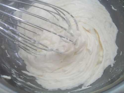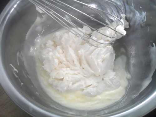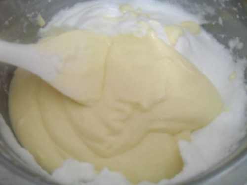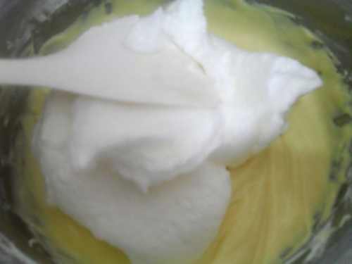 11取一部分蛋白倒入酸奶糊里,用刮刀从底部往上翻拌均匀。