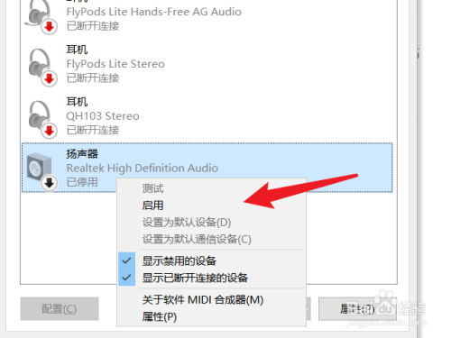 最后在声音控制面板,鼠标右键选择扬声器,点击启用即可解决喇叭小红叉问题。