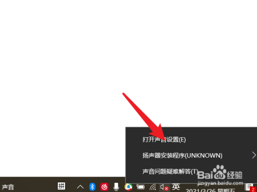 1、首先在桌面鼠标右键单击,选择打开声音设置。