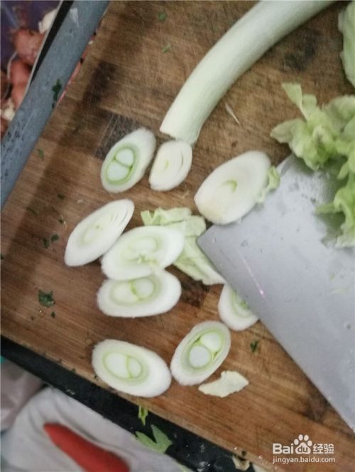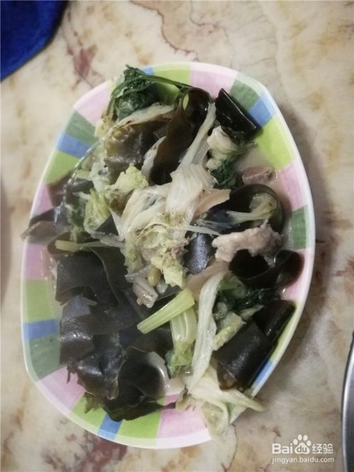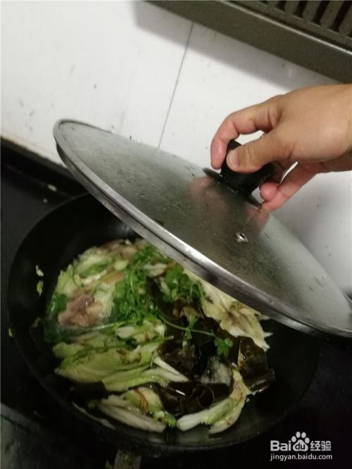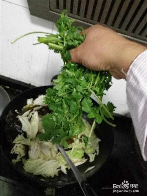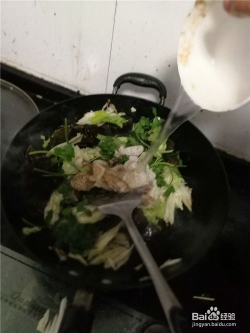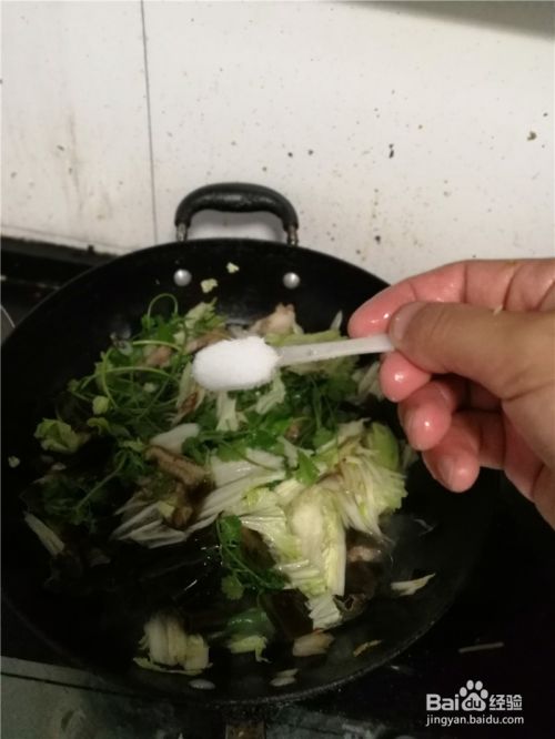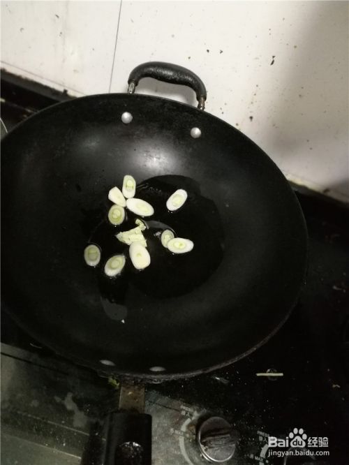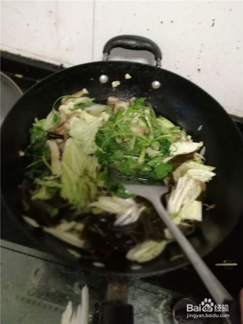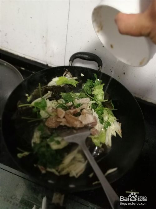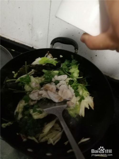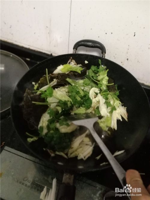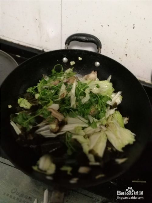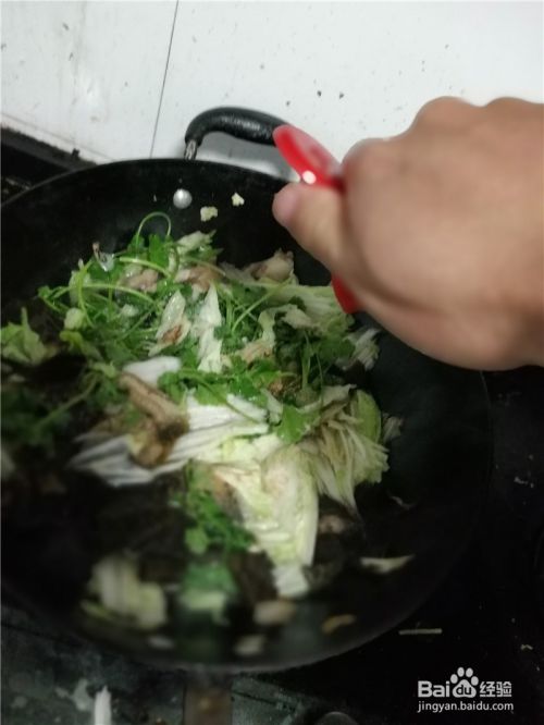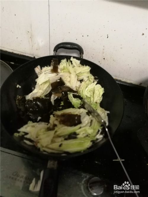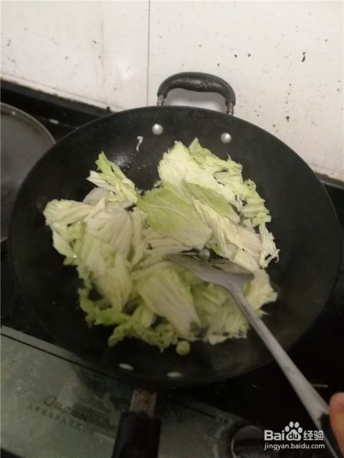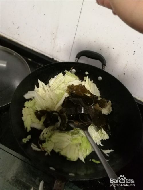 葱下锅炒香后下入白菜和海带进行翻炒均匀