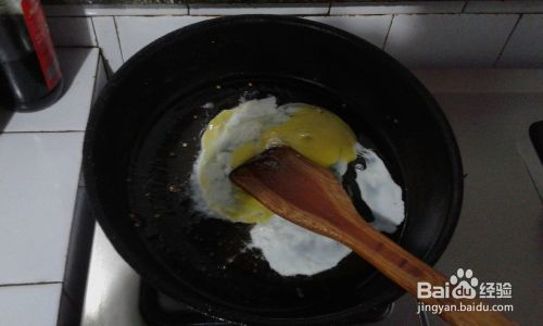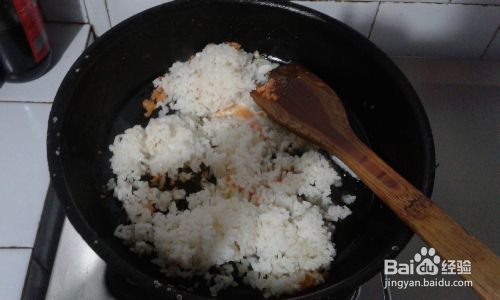 把平锅放好,点火放少许色拉油,点火,锅微热时,将鸡蛋打入锅中,用锅铲将鸡蛋搅拌一下,放入胡萝卜丁,翻炒几下,然后将米饭倒入锅中,用锅铲将结块的米饭压散开来。
