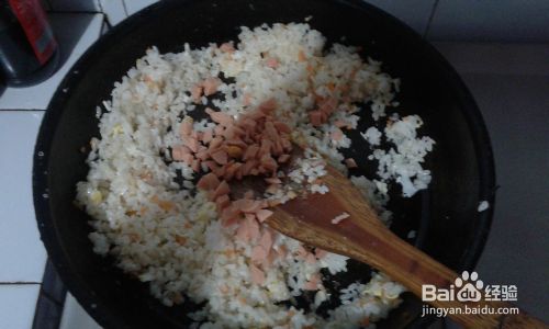 米饭完全散开时,撒上盐再翻炒几下,再将火腿肠放入锅中翻炒几下,关火,盛出米饭就可以吃了。