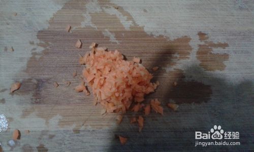将米饭,鸡蛋拿出来,胡萝卜切成丁,接着将火腿肠切成小碎丁备用。