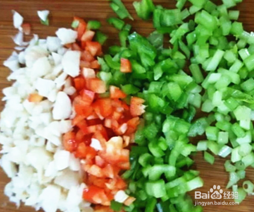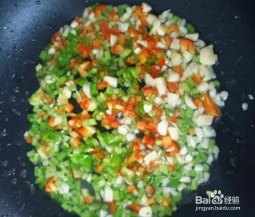 6锅洗净蒸干,放入少量的油。油热后,放入青红椒粒、芹菜粒、蒜泥,炒香。