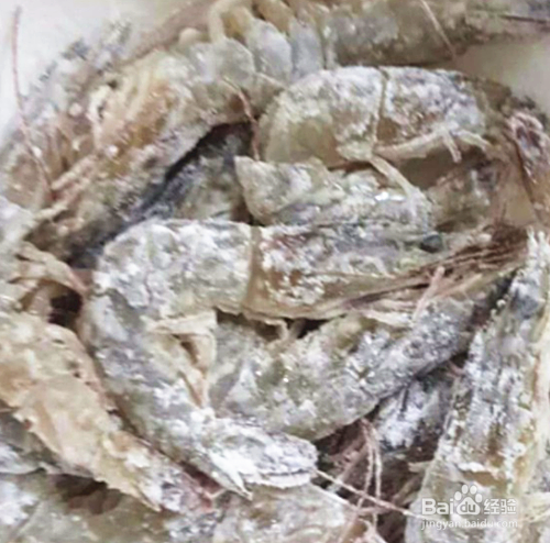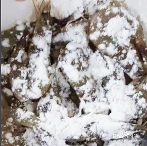 盆中放入适量的淀粉,搅拌均匀,让每个虾都均匀的粘上淀粉。