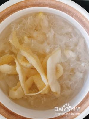 将锅里加入开水,放入银耳和梨皮大火烧开转小火煮二十分钟。