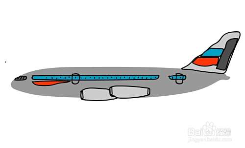 使用明暗灰色填充民航客机的机身,再用蓝色填充窗户区域,使用蓝色与红色搭配填充尾翼色彩线条,再用灰白色填充油箱,完成民航客机的简笔画设计。