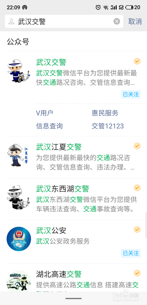 打开手机微信APPP,在公众号搜索地方交警,例如武汉车主搜索武汉交警,如下图: