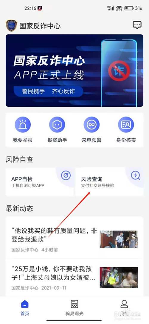 2、进入国家反诈中心APP,点击风险查询