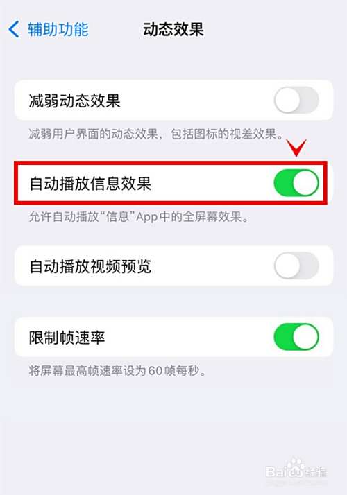 进入【动态效果】界面——开启【自动播放信息效果】右侧的开关键即可。