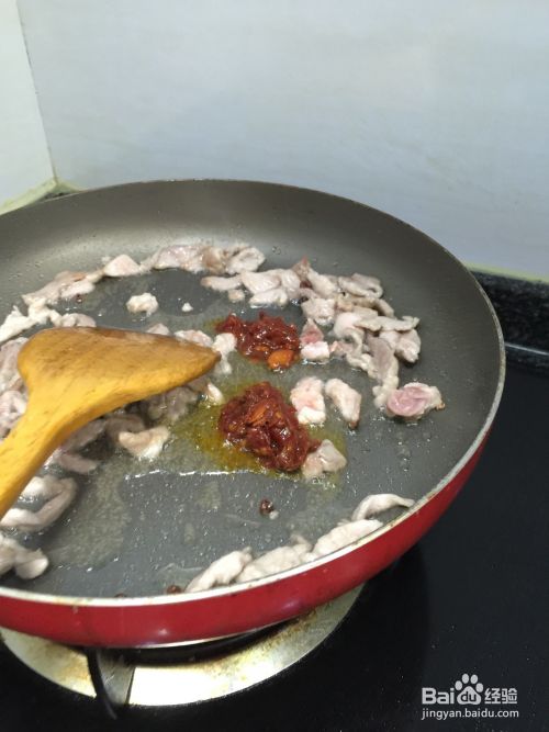 倒入拌好的瘦肉,迅速翻炒开。等肉7分熟时放2勺豆瓣炒开。要注意这个时候油很容易飞溅出来哦。