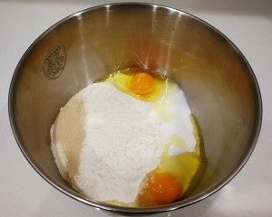上一张准备和面前的图(图片是1公斤面,所以放了两个鸡蛋),盐和糖放在一边,酵母放在一边,在未开始揉面前盐和糖一定不要和酵母碰面。