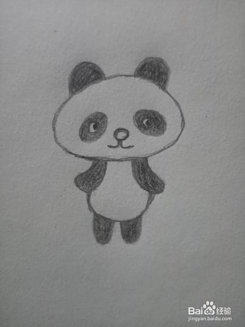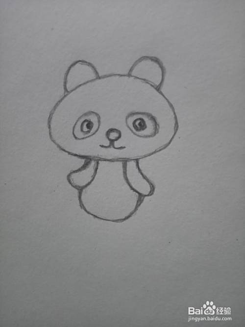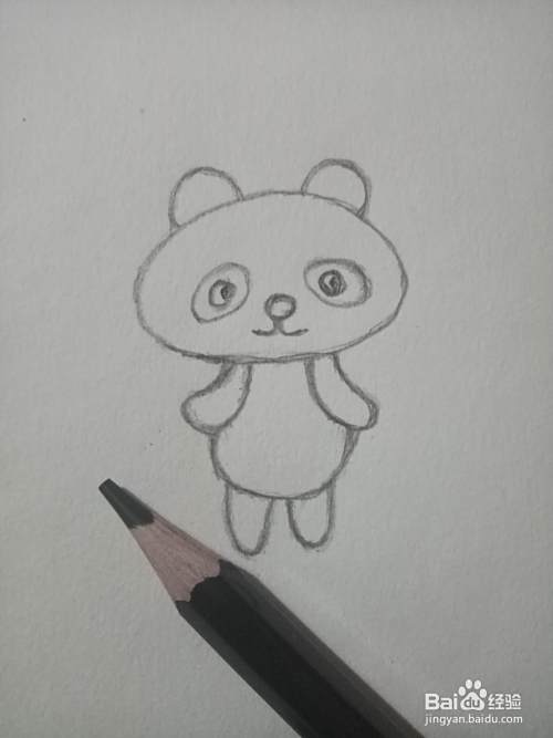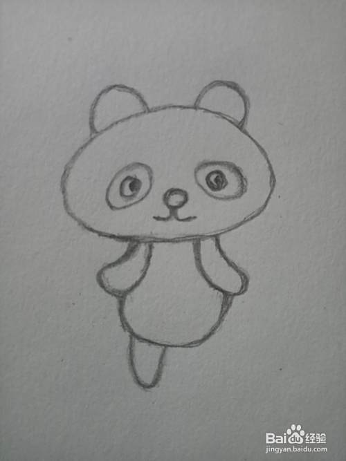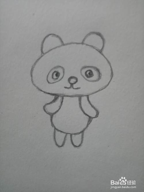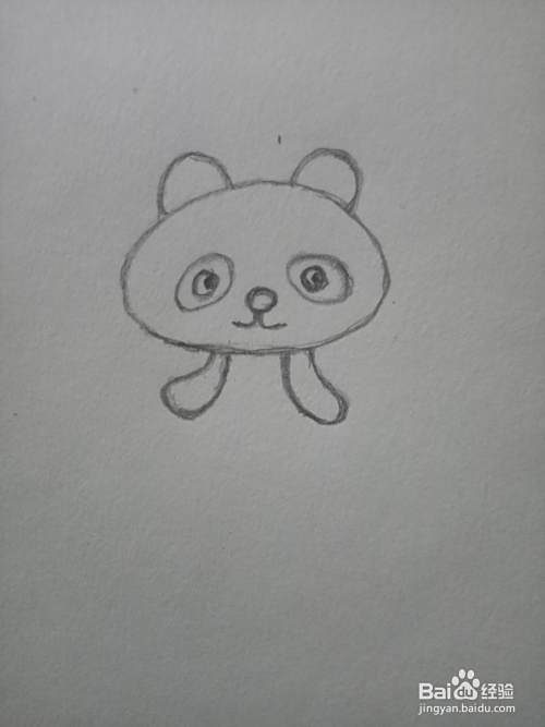 画一个圆圈,做熊猫的鼻子,再画两笔,做熊猫的嘴巴,在画上熊猫的两只手。