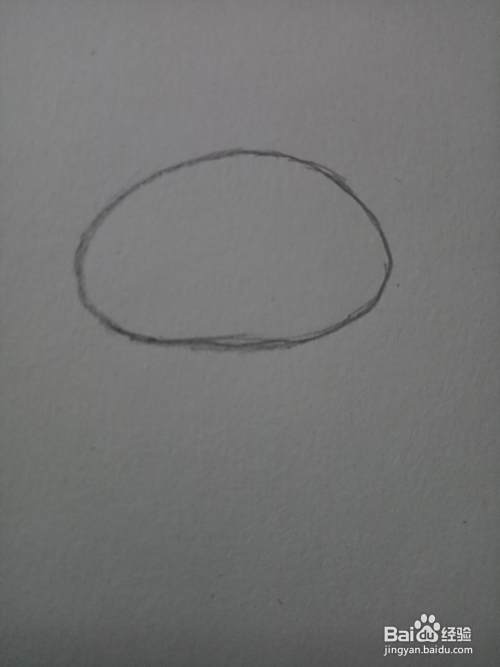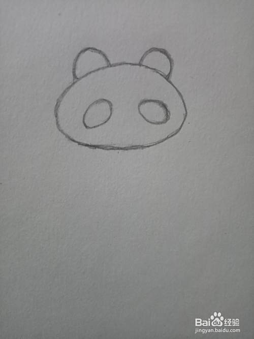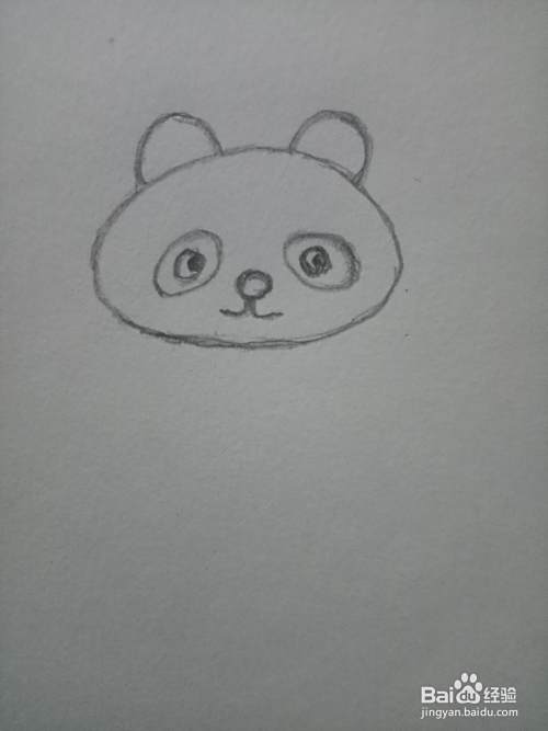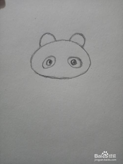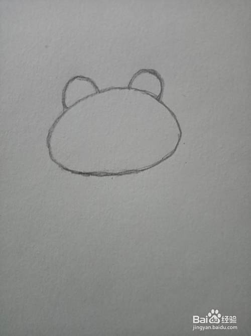 画一个扁扁的圆圈,做熊猫的脸部,画两个半圆,做熊猫的两只耳朵黑。