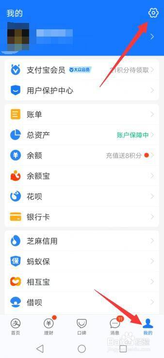 打开手机支付宝,点击右下角我的,选择设置图标。
