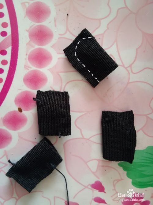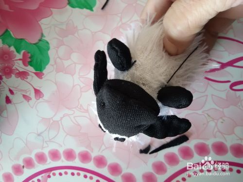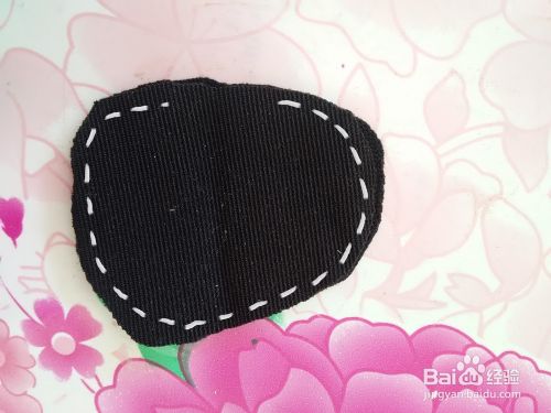 按图剪出耳朵布块,把布块正面相对按虚线处缝好(如图),缝好后把布块从收口处把里面翻过来,再底端用针线缝好缝出耳朵形状(如图),再把耳朵缝在头部合适位置上(如图)。