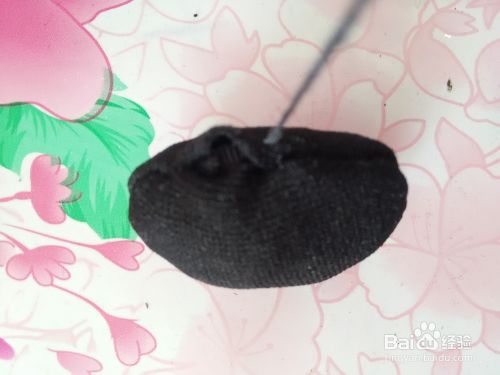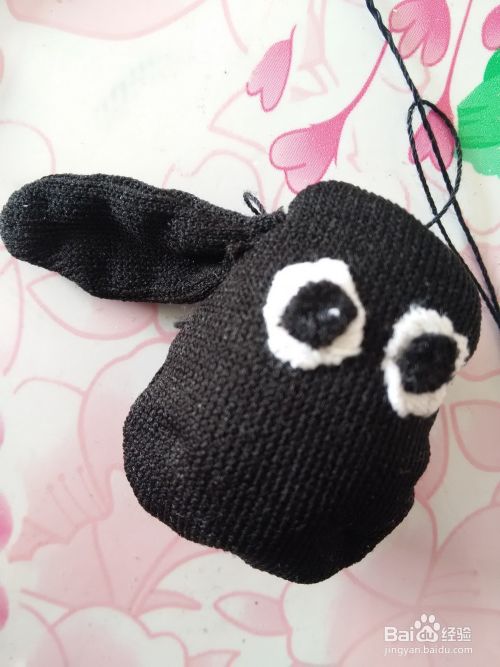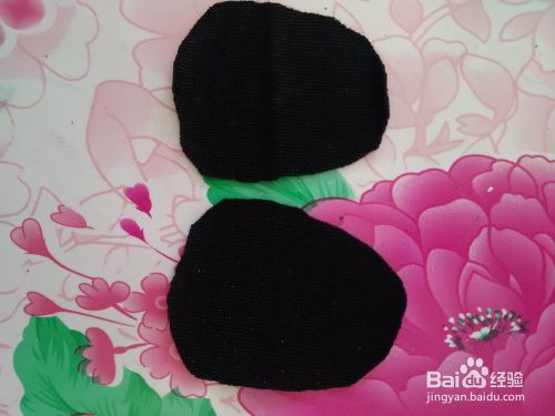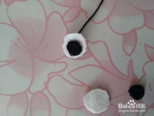 按图剪出眼睛布块,把黑色布块缝在白色布块上(如图),再把缝好的眼睛用针线缝在头部合适位置上(如图)。