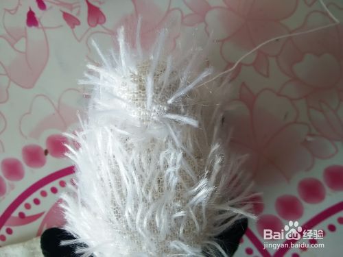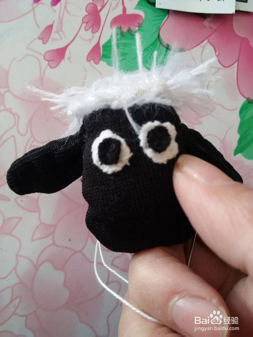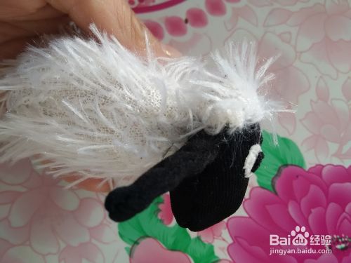 把布块从收口处把里面翻过来,塞入填充物用针线缝好收口(如图),再把小羊的头缝在收口处固定缝好(如图)。