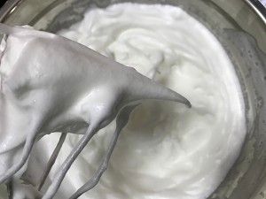 接下来把蛋清打发,糖要分三次加入,用电动打蛋器低速先把蛋清打发至鱼眼泡状态,这是加入第一次糖粉;继续打发至细密的泡沫时加入第二次糖粉;打发至有明显的纹路时加入第三次糖粉,最后打发到提起打蛋器有大弯钩,就是湿性发泡就可以了。敲黑板:打发前可以加入几滴柠檬汁,没有柠檬汁可以加几滴白醋,这样可以去除蛋腥味,同时可以稳定打发的状态。打发蛋清时我一般都用低速打发,这样比高速打发出来的不易消泡,就是会慢一点,一般需要几分钟的时间。千万不要把蛋白打成干性发泡,那样即便是水浴法也容易开裂,打蛋盆的边缘一定要打到位,打发好的蛋白有光泽而且非常细腻。