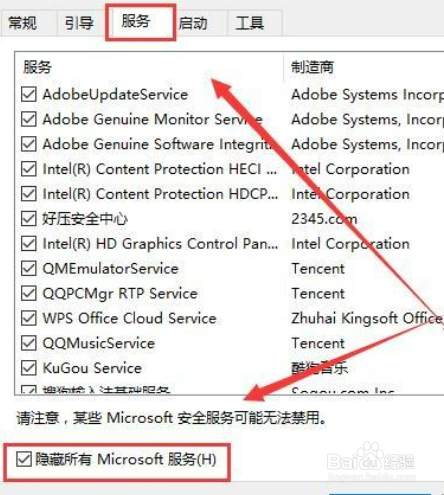 在【服务】选项中勾选【隐藏所有Microsoft服务】然后点击【全部禁用】(若您启用了指纹识别功能,请不要关闭相关服务)。