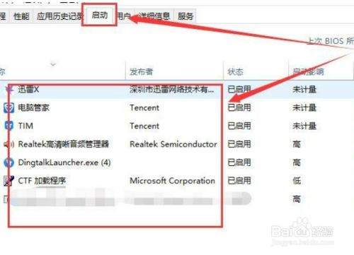 按下【Ctrl】+【shift】+【esc】启动【任务管理器】,点击 【启动】 选项卡,将所有启动项都禁用。