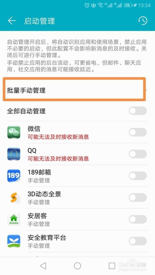 手机管家->启动管理->批量手动管理->后台活动->只留下需要后台活动的应用。