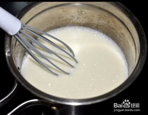 接着准备一口奶锅,将牛奶倒入锅中,并将刚搅散的蛋黄液倒入,再滴几滴柠檬汁,一边加热一边搅拌;