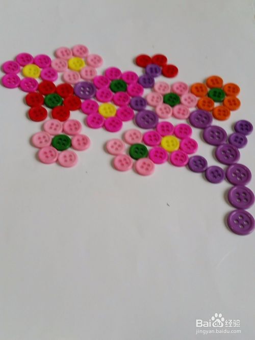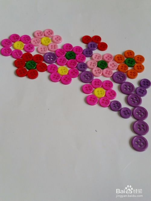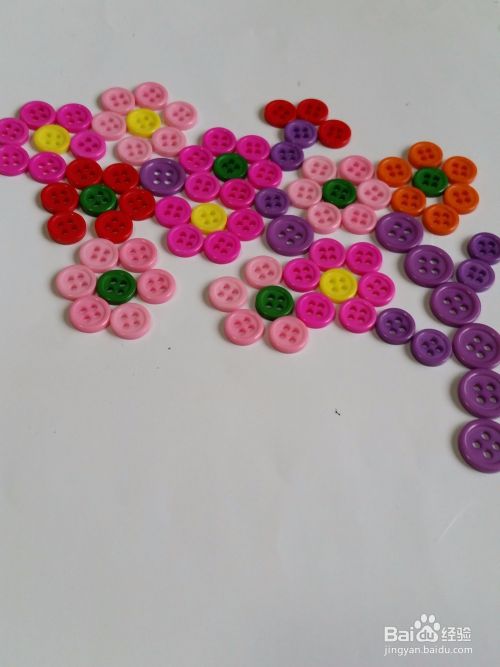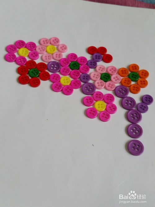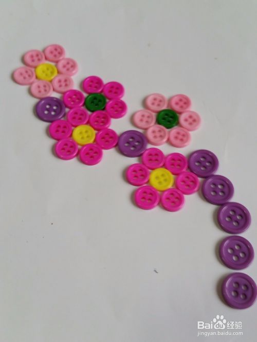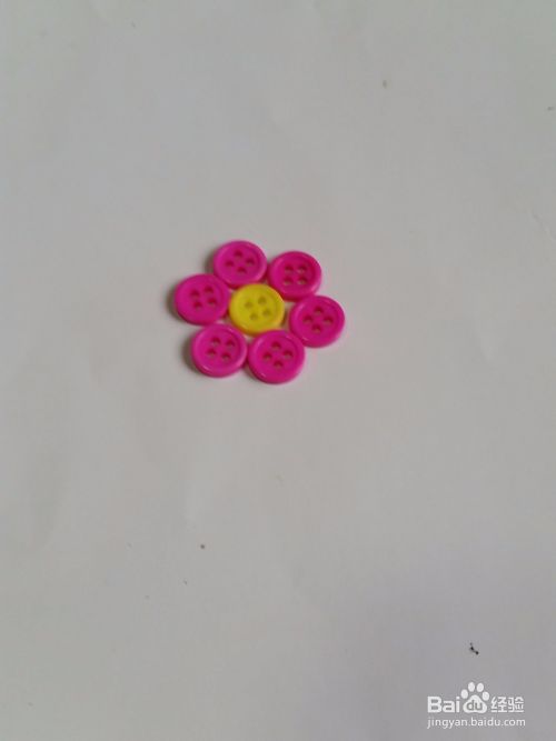 我们先在约上用黄色纽扣做花心,外面用粉色的纽扣做花朵做一朵梅花