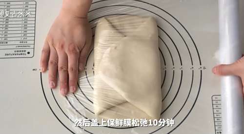 10两端往中间折叠,盖上保鲜膜,松弛10分钟。