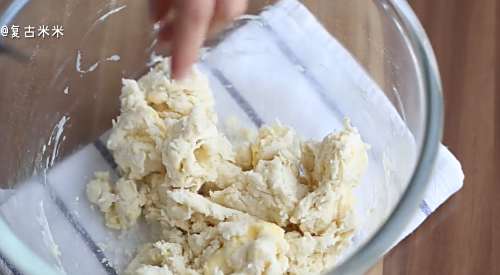 6打好的蛋黄倒入碗中,加入低筋面粉、黄油、盐,用橡胶铲搅拌成柔软的面团。