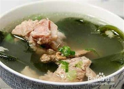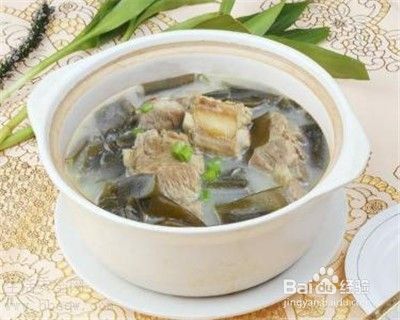 材料:海带100克、绿豆100克、陈皮1/3个、猪脊骨500克、生姜3片。