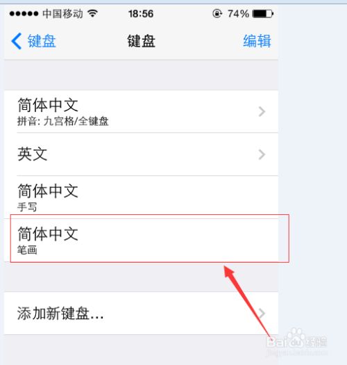 第六步进入“添加新键盘”的页面,我们可以看到很多输入法:简体中文笔画、繁体中文手写、繁体中文拼音等。我们以添加简体中文笔画比例,点击简体中文笔画功能键。