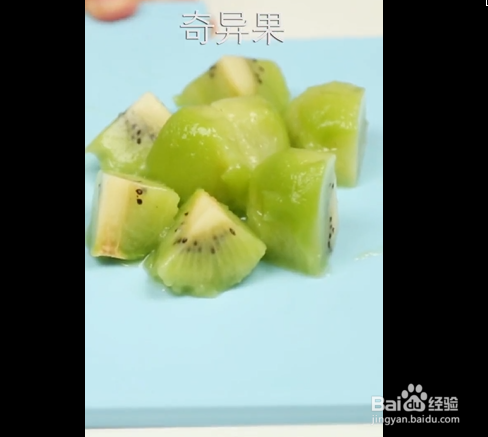 第1步,把准备好的奇异果去皮,切成小块,放入杯中,倒入酸奶,