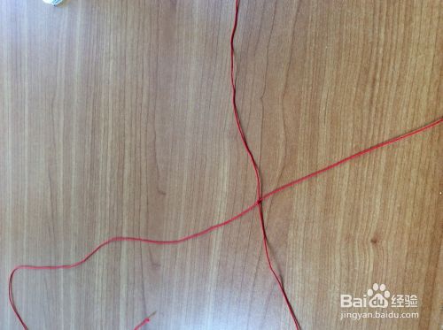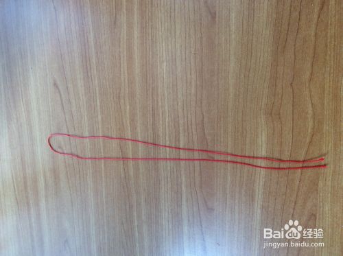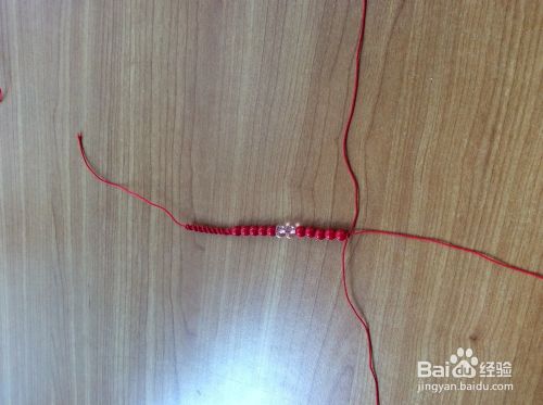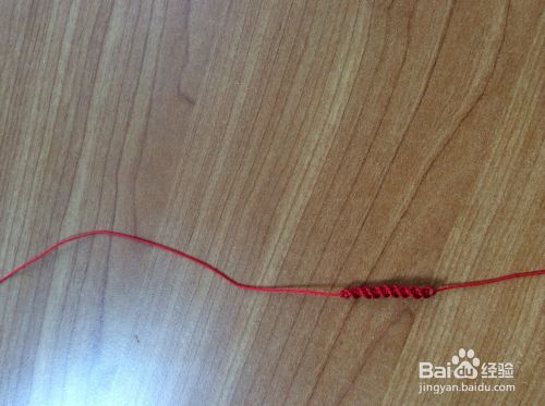 在一根红绳的底部留出一点点位置,编织弯曲平结。编好之后用打火机烧掉线头。