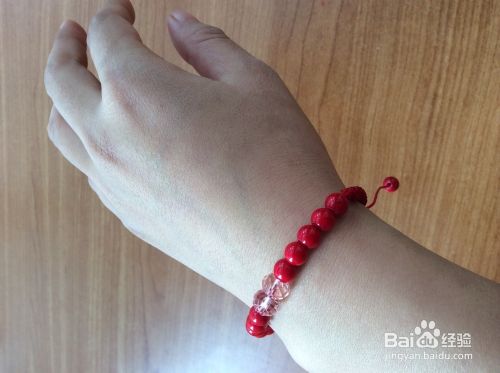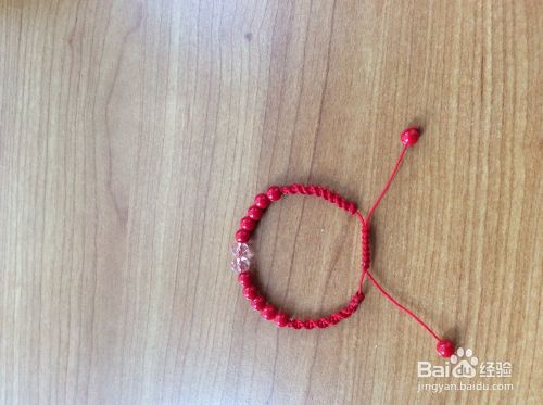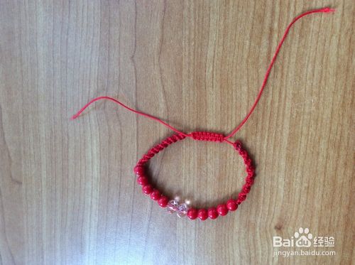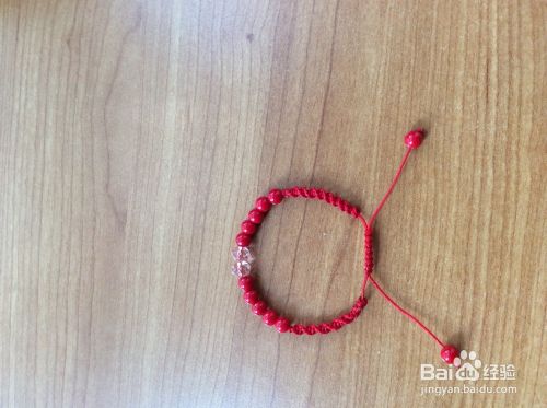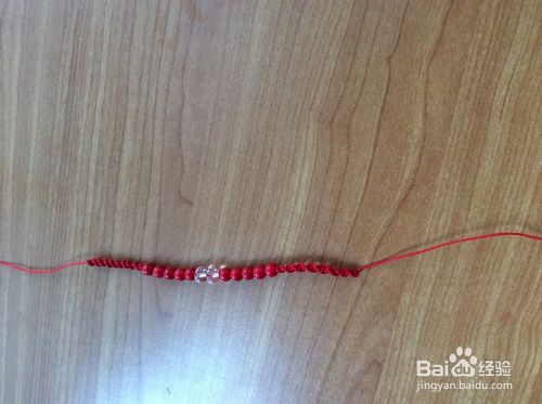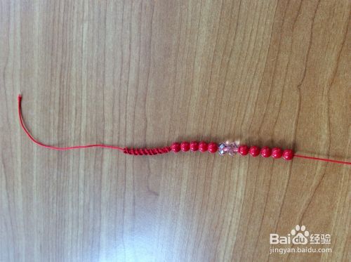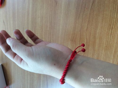 在两根红绳上分别穿上珠子。打结。我的串珠手链就编织好了