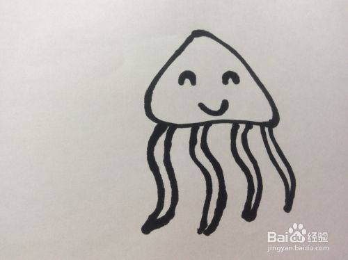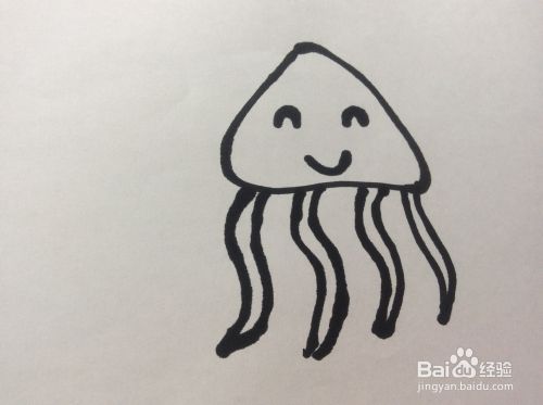 在三角形外侧下端画出更多个形状不规则的长长的闭合形状。水母的简笔画就完成了。