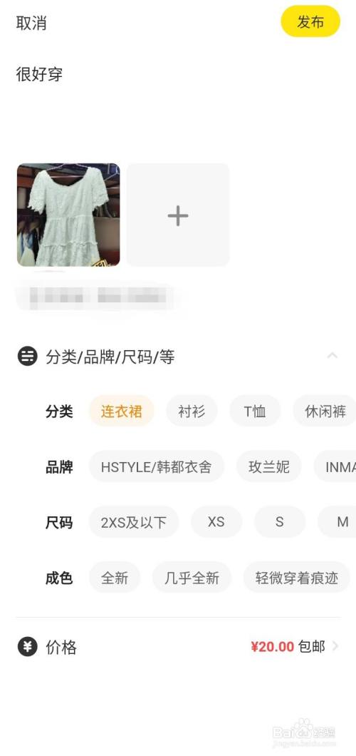 最后,进入物品详情描述和选择页面。在最上方输入框中输入物品的详细介绍,在下方根据提示选择物品的属性,尺码,分类,价格等。完成后点击右上角的【发布】