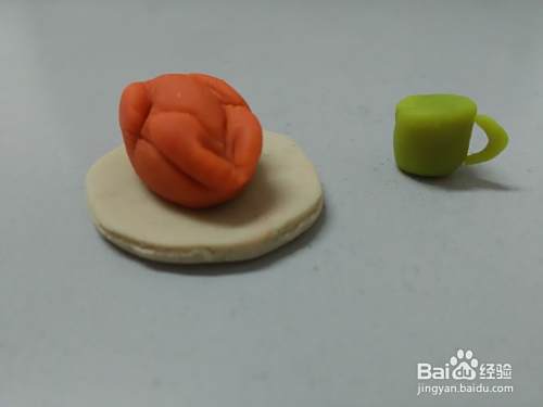 再用黄彩泥搓一个细条,弯一下,粘在杯子侧面,当作杯子的把儿。