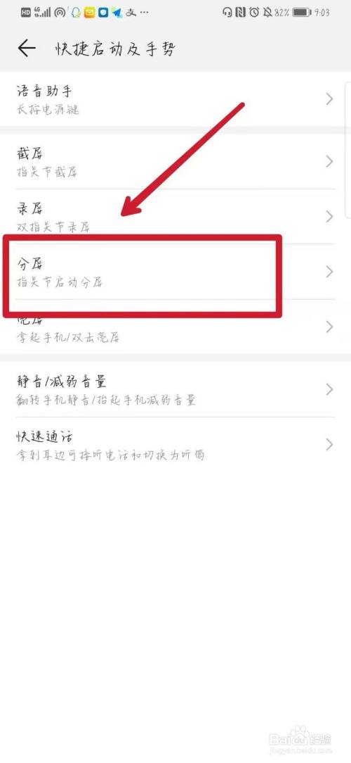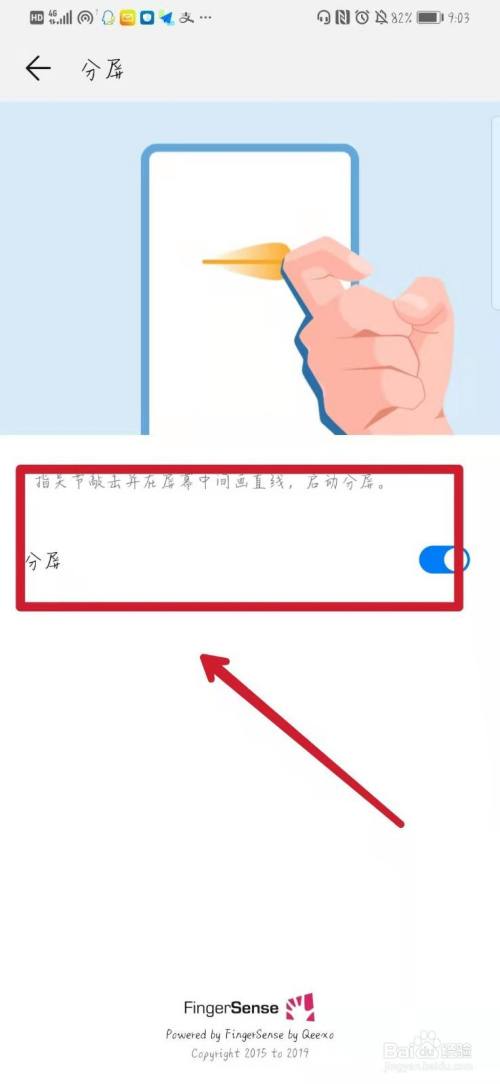 点击【分屏】,即指关节敲击并在屏幕中间画直线,启动分屏。