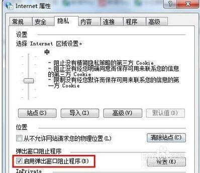 在打开的Internet属性窗口中,选择“隐私”标签,再点击“设置”按钮。