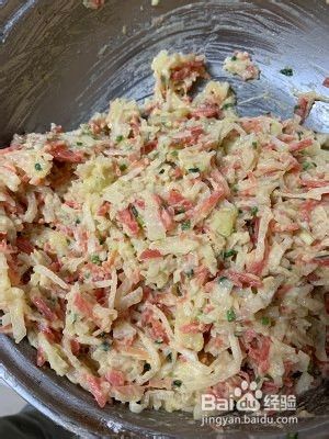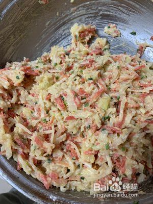 土豆蒸熟捣成土豆泥。加土豆完全是因为家里还有这几个小土豆,也凑不成一盘土豆丝,就加进去了,如标题,有啥放啥哈哈哈