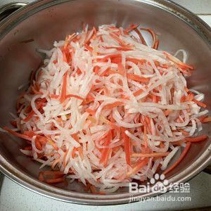萝卜切丝,放盐腌制出水,我看好多地方都是用绿萝卜,坐标湖北还没有见过呢,下次有机会一定试试,用的我们这边的大白萝卜,挺甜的