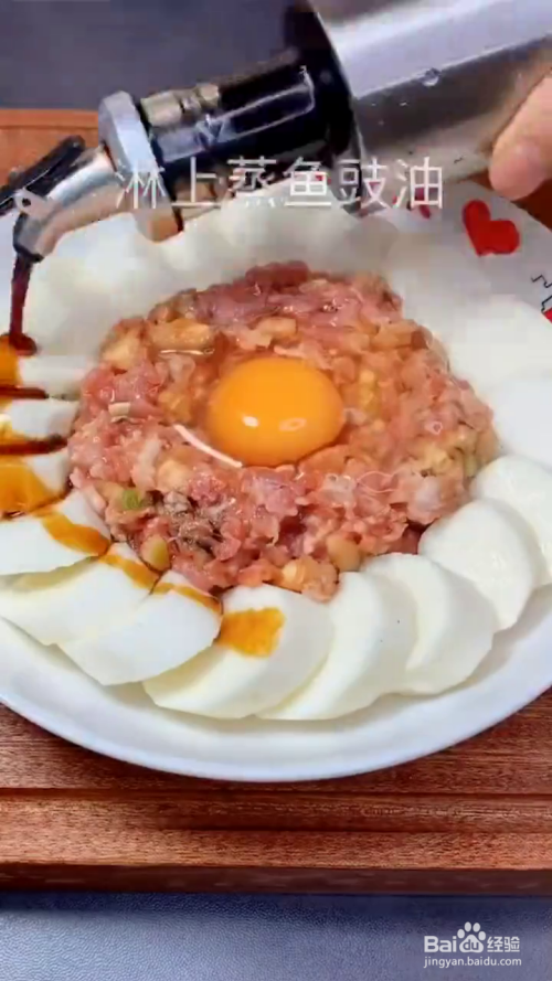 然后将其在盘中同样摆成圆环状,接着在最中间打入一个鸡蛋,淋上蒸鱼豉油
