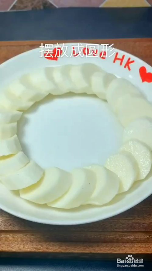 我们带着手套,将山药削皮,山药的粘液会让手发痒,之后切片在盘子上面摆成圆环状,然后将猪肉搅成末