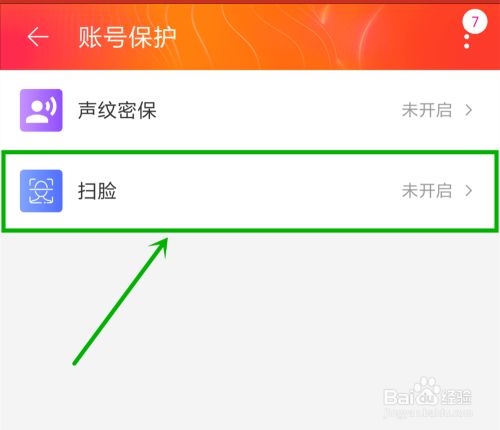 在【账户保护】界面我们会看到两个验证方式:声纹密保和扫脸,这里我们只介绍【扫脸】,点击此选项