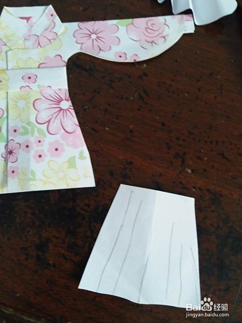 下面我们在做一个长条放在衣服的腰间当做腰带,后面也是要用胶水固定一下。然后我们再把一小块白纸剪出裙子的形状,可以画上些线条做褶皱。