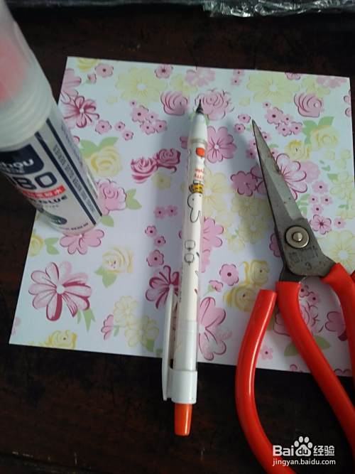 首先我们要准备好一张正方形彩纸,一把剪刀,一支笔,一瓶胶水备用。然后我们把彩纸的中线对折一下。