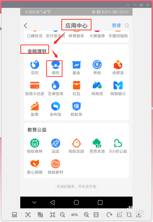 第二步,在应用中心找到金融理财,点击“借呗”