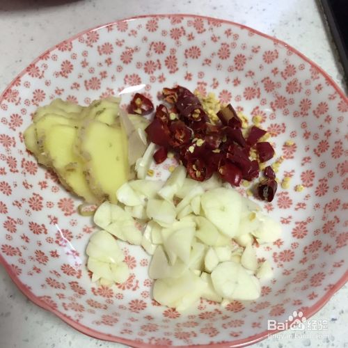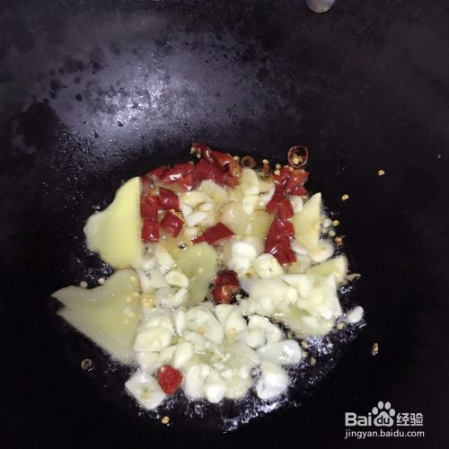 锅烧热,放少许油,先将切好的生姜倒入锅内,然后将大蒜沫跟干辣椒也倒入锅内,煸出香味!