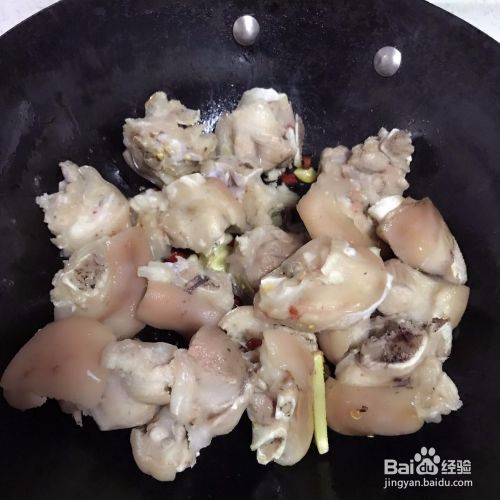 然后将绰好水的猪蹄倒入锅内(倒的时候从一侧倒入,防止锅里油溅出来),翻炒,当猪蹄全部沾上油时加入适量白砂糖,继续翻炒!